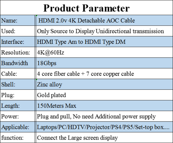 Name:HDMI 2.0v 4K type A to D detachable AOC cable