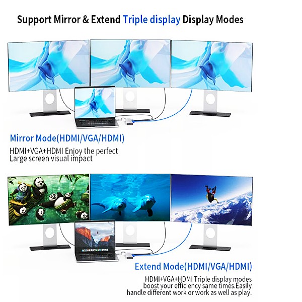 [Important note] Extended mode supports Windows system to stream different images on three displays. Due to the limitation of Mac OS, the images on the MAC device on both screens will display the same.