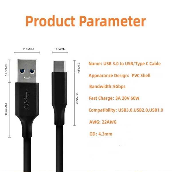 • Product description: USB3.0 A to Type C charge cable,support 3A Charge, 60W(20V/3A) Power, 5Gbps bandwidth, 3Meter max.