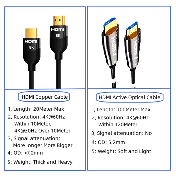 As the price of copper wire continues to rise and the mass production of photoelectric conversion modules, fiber optic cable is gradually replacing copper wire as the main force; today we will come together to understand the HDMI fiber optic cable, namely: HDMI-AOC (active optical cable, there source cable); it is an HDMI cable that uses optical fiber for the HDMI signal transmission line and integrates it into thephotoelectric conversion wire interface. Fiber is an abbreviation for optical fiber, a fiber made of glass or plastic. Can be used as a light transmission tool, the transmission principle is "perfect reflection of light"
