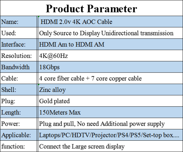 • Product description: HDMI 2.0 4K AOC cable,support 4K@60Hz,18Gbps bandwidth,DHCP 2.2,HDR 10,EDID,CEC,DDC,3D, ARC.