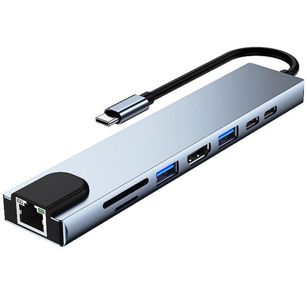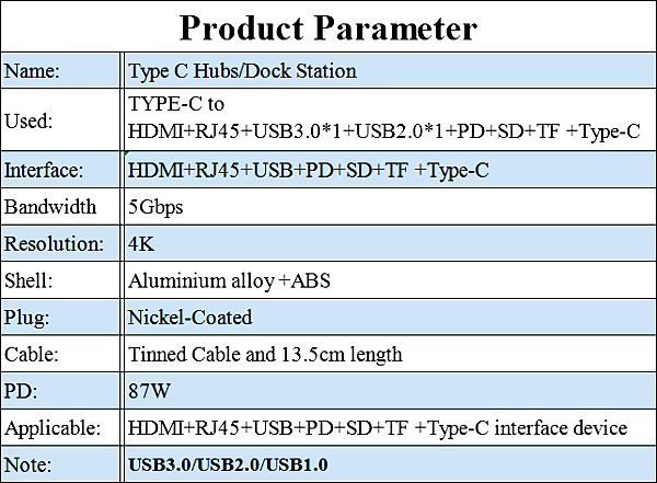 Interface:TYPE-C to HDMI+RJ45+USB3.0*1+USB2.0*1+PD+SD+TF +Type-C data