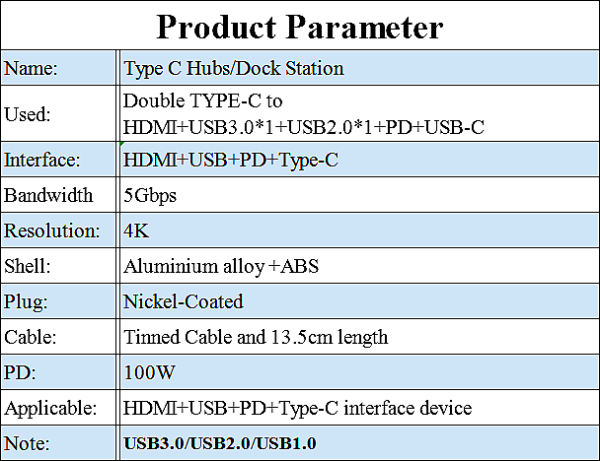 Interface:TYPE-C to HDMI+USB3.0*1+USB2.0*1+PD+SD+TF